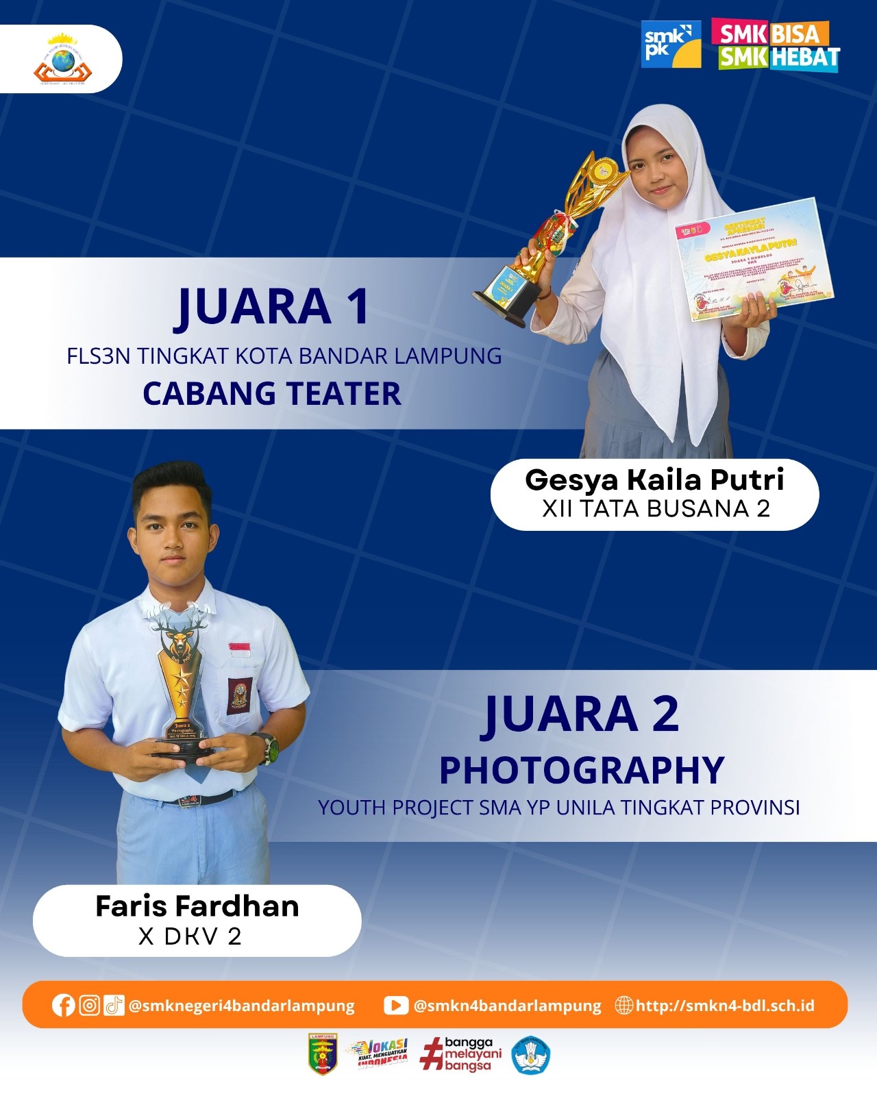 FLSN tahun 2025 ini SMKN 4 Bandar Lampung Menorehkan 6 enam prestasi di antara nya,Juara 1 Cabang teater tingkat Bandar Lampung di raih oleh Gesya kaila putri kelas Xl Tata Busana,Faris Fardhan juara 2 dua Photo Graphy tingkat Provinsi ,untuk cabang Musik tradisional meraih juara 2 dua,tingkat Bandar Lampung ,Dan HaLL OF TAME juara 3 UNDERU -19 putra Maha Pala Orientering AND climbing competition ,di raih oleh Indra azizzuliansyah Juara 3 Essay competition Lingkungan hidup 2025 di raih oleh cilia Anggraini