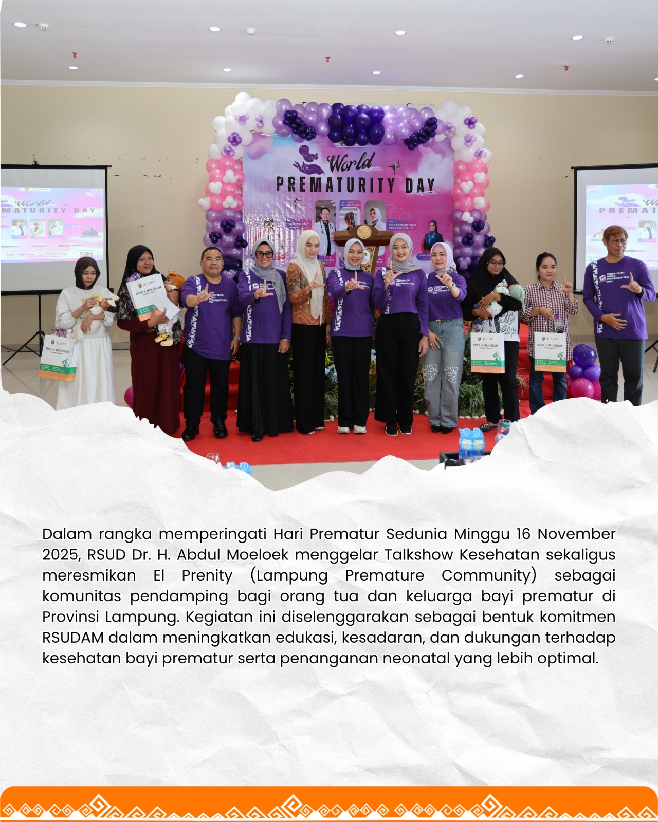 Bandar Lampung, Lampungpagi.com, Bertempat di Aula Delima – 16 November 2025, RSUD Dr. H. Abdul Moeloek Provinsi Lampung menyelenggarakan peringatan Hari Prematur Sedunia yang dirangkaikan dengan peresmian inovasi layanan terbaru bernama El Prenity pada 16 November 2025 bertempat di Aula Delima RSUD Dr. H. Abdul Moeloek. Acara ini dihadiri oleh Ibu Gubernur, Wakil Gubernur, Ketua TP PKK Prov Lampung , Direktur RSUDAM dr. Imam Ghozali, Sp. An., KMN., M.Kes. & Jajaran Manajemen, Pasien & Perwakilan Keluarga.